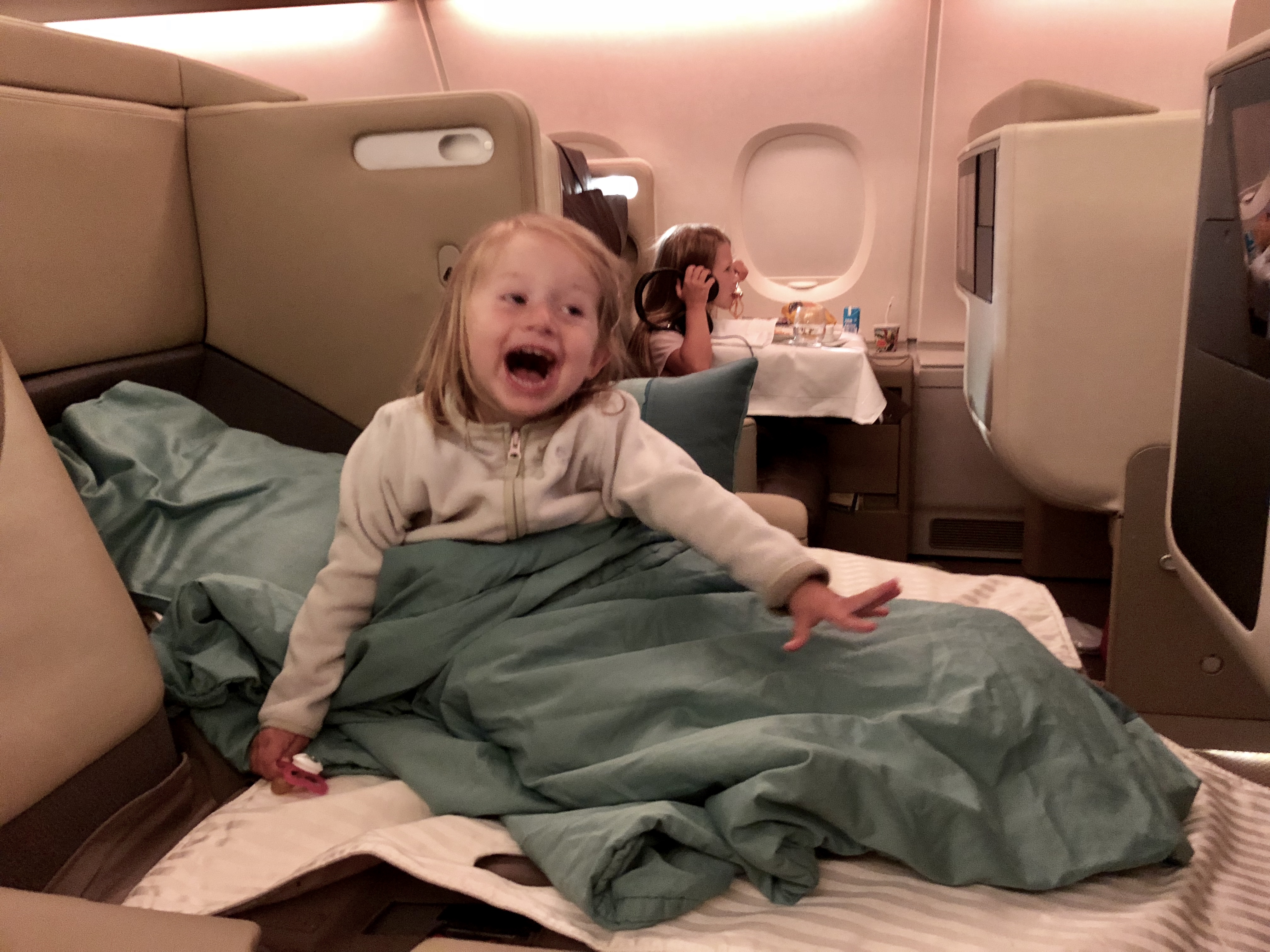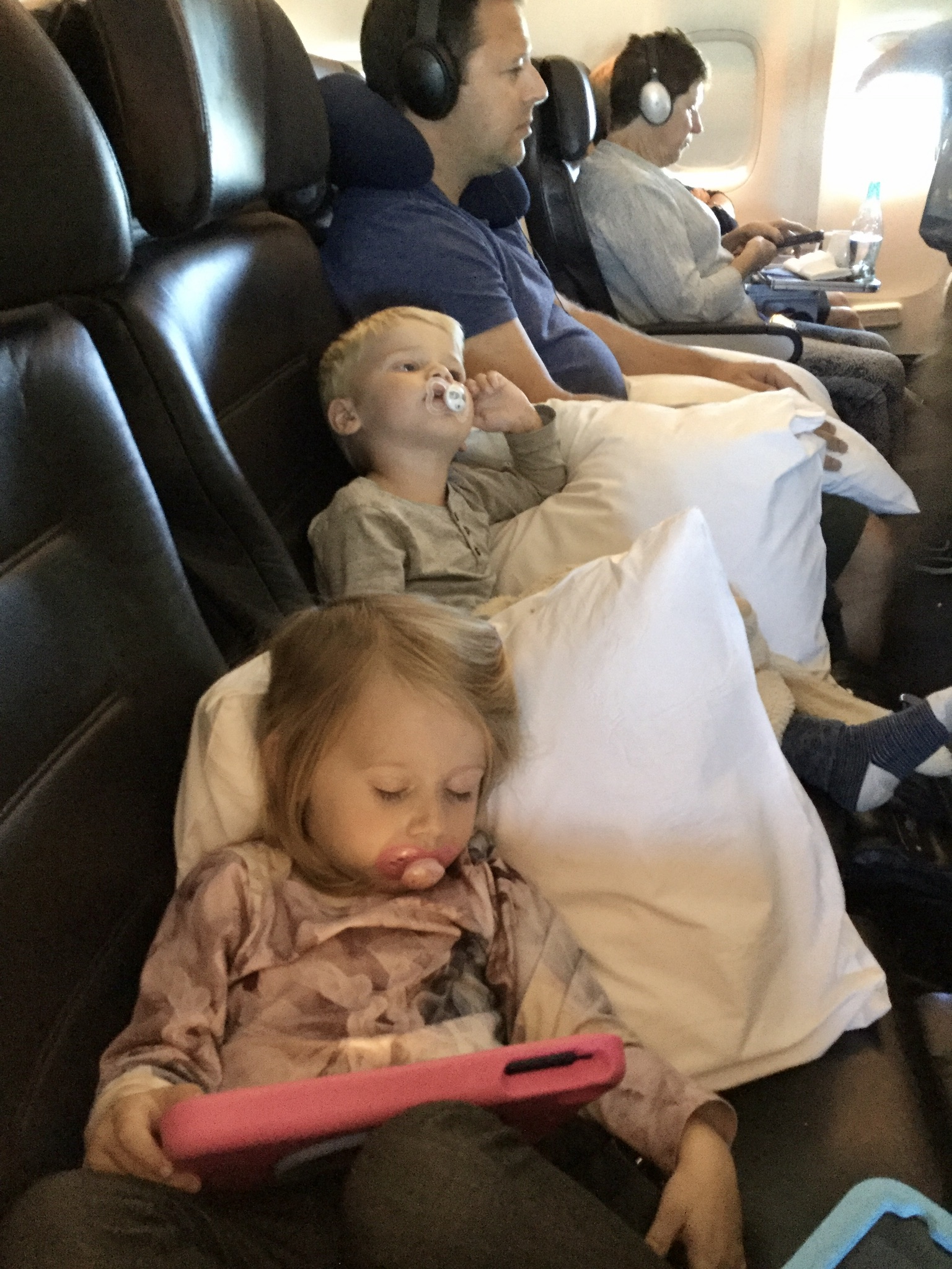 De fleste af vores lange flyvninger (over 5 timer) foregår om natten og på Business Class. Vi kan dermed oftest lægge sæderne helt ned og ungerne kan få en god nats søvn (det er altid begrænset hvor meget vi forældre får sovet) ;o)